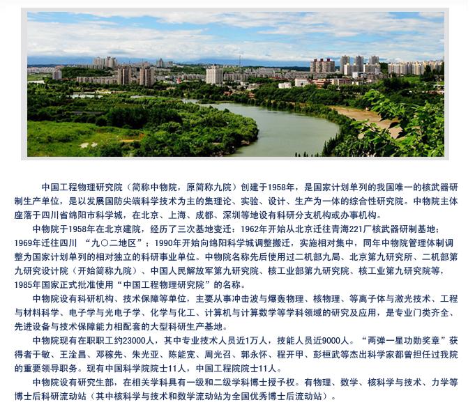 中國工程物理研究院(China Academy Of Engineering Physics),簡稱"中物院",是國家科研計劃單列的中國唯一的核武器研制生產(chǎn)單位,是以發(fā)展國防尖端科學(xué)技術(shù)為主的集理論、實驗、設(shè)計、生產(chǎn)為一體的綜合性研究院。